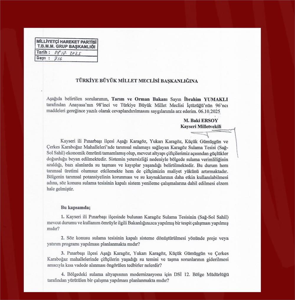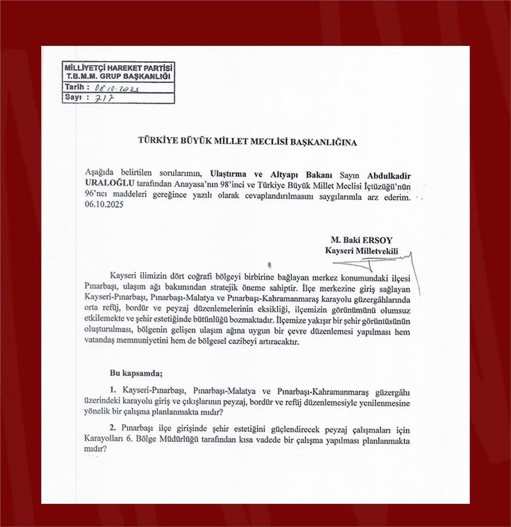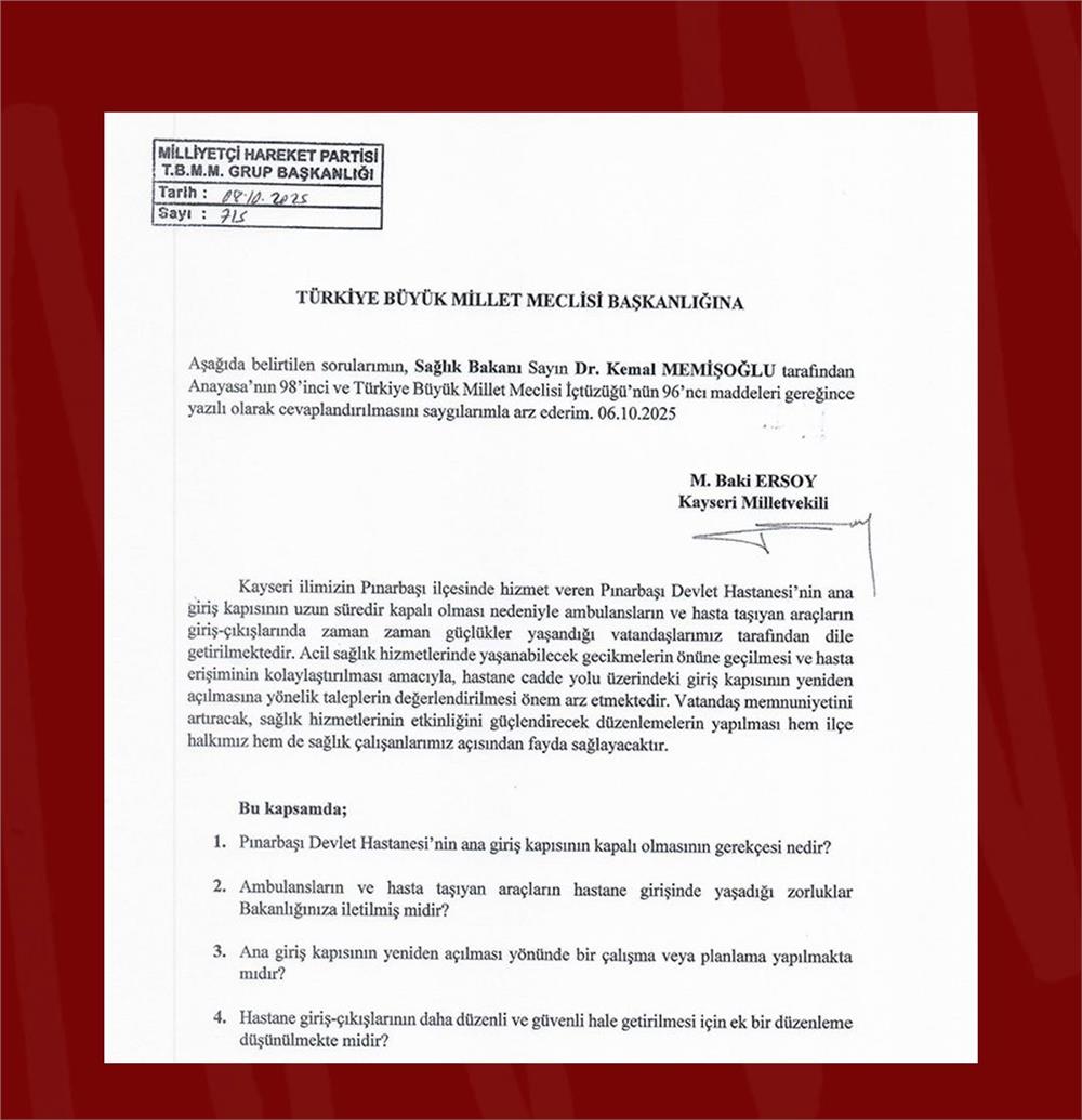MHP Kayseri Milletvekili Baki Ersoy, Pınarbaşı ilçesinde yaşanan ulaşım, sağlık ve tarımsal altyapı sorunlarını Meclis gündemine taşıdı. Ersoy, üç ayrı bakanlığa sunduğu soru önergeleriyle bölge halkının uzun süredir çözüm beklediği konulara dikkat çekti.