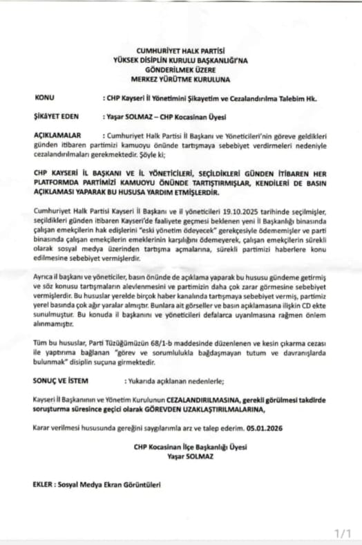 CHP Kocasinan ilçe üyesi Yaşar Solmaz, Kayseri teşkilatının partiyi kamuoyunda tartıştırdığı iddiasıyla yazılı bir şikayet dilekçesi hazırladı. CHP Yüksek Disiplin Kurulu Başkanlığına dilekçeyi gönderen Solmaz, şu ifadelere yer verdi; “Cumhuriyet Halk Partisi İl Başkanı ve yöneticilerinin göreve geldikleri günden itibaren partimizi kamuoyu önünde tartışmaya sebebiyet vermeleri nedeniyle cezalandırılmaları gerekmektedir. Şöyle ki; CHP İl Başkanı ve yöneticileri, seçildikleri günden itibaren her platformda partimizi kamuoyu önünde tartışmalara başlar, kendileri de basın açıklaması yaparak bu hususa yardım etmişlerdir. Cumhuriyet Halk Partisi Kayseri İl Başkanı ve yöneticileri 19.10.2025 tarihinde seçilmişler, seçildikleri günden itibaren Kayseri’de faaliyete geçmesi beklenen yeni İl Başkanlığı binasında çalışan emekçilerin hak edişlerini ‘eski yönetim ödeyecek’ gerekçesiyle ödememişler ve parti binasında çalışan emekçilerin emeklerinin karşılığını ödemeyerek, çalışan emekçilerin sürekli olarak sosyal medya üzerinden açıklamalarına, sürekli partimizi haberlere konu edilmesine sebebiyet vermişlerdir.”