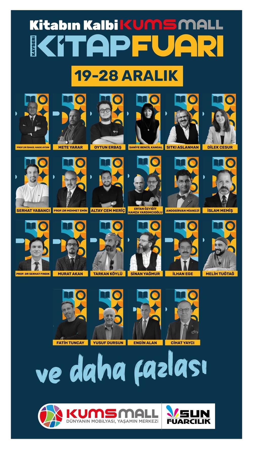Mete Yarar, Mehmet ali Bulut, Zekeriya Efiloğlu, Engin Alan, Oytun Erbaş, İslam Memiş, Saniye Bencik Kangal, Cihat Yaycı, Sıtkı Aslanhan, Dilek Cesur, Serhat Yabancı, Murat Akan, Altay Cem Meriç, Sinan Yağmur, Prof. Dr. Mehmet Emin Ay, Melih Tuğtağ, Kum Sanat gösterisiyle Tarkan Köylü, Prof. Dr. Serhat Fındık, Andosirvan Miandji ve Hatice Nur Ege’nin de aralarında bulunduğu 100’den fazla yazarın katılacağı KUMSmall Kitap Fuarı 10 gün sürecek.