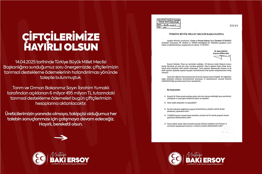 Ersoy paylaşımında şu ifadelere yer verdi; "Çiftçilerimize hayırlı olsun. 14.04.2025 tarihinde Türkiye Büyük Millet Meclisi Başkanlığına sunduğumuz soru önergemizde; çiftçilerimizin tarımsal destekleme ödemelerinin hızlandırılması yönünde talepte bulunmuştuk. Tarım ve Orman Bakanımız Sayın İbrahim Yumaklı tarafından açıklanan 6 milyar 495 milyon TL tutarındaki tarımsal destekleme ödemeleri bugün çiftçilerimizin hesaplarına aktarılacaktır. Üreticilerimizin yanında olmaya, takipçisi olduğumuz her talebin sonuçlanması için çalışmaya devam edeceğiz. Hayırlı, bereketli olsun."