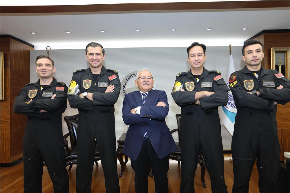 Kayseri Bilim Festivali kapsamında muhteşem bir gösteriye hazırlanan SOLOTÜRK ekibi, 1. Pilot Yarbay Murat Bakıcı öncülüğünde Kayseri Büyükşehir Belediye Başkanı Dr. Memduh Büyükkılıç’ı ziyaret etti.