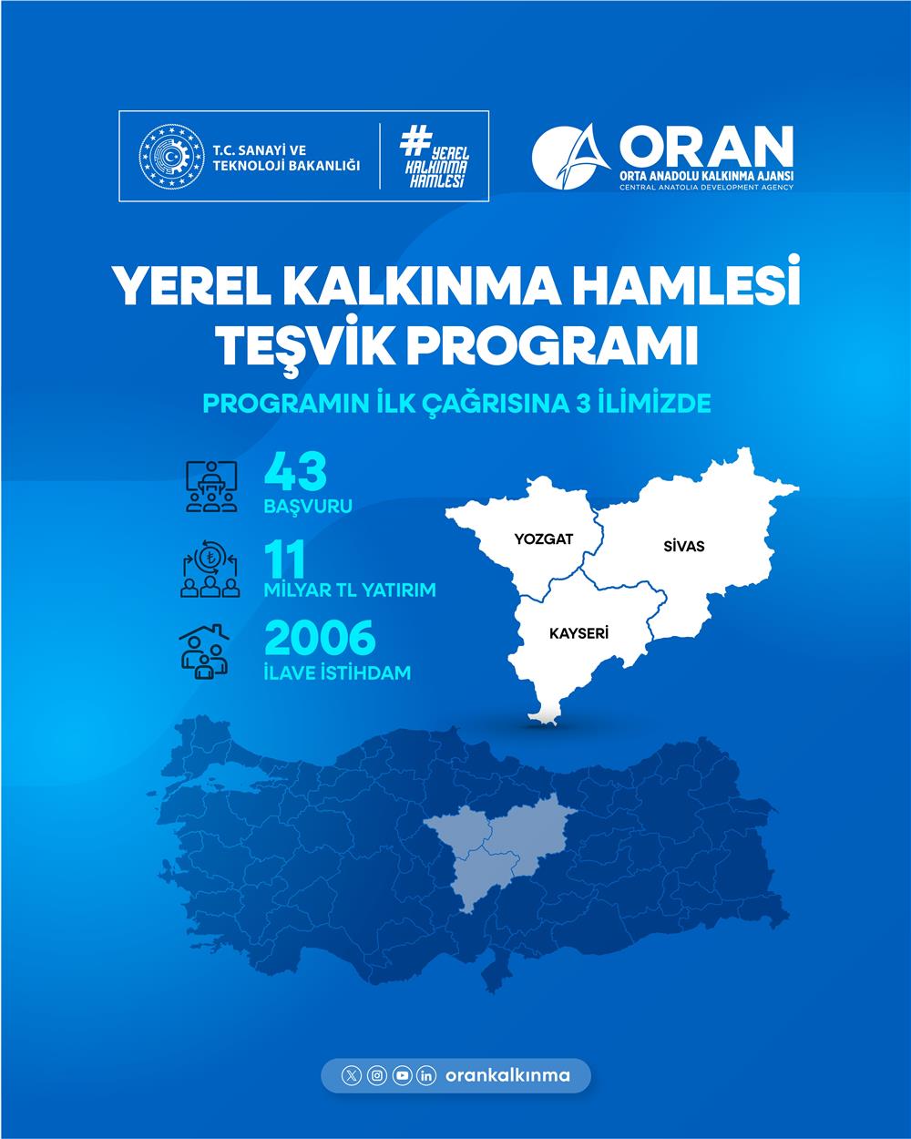 Sanayi ve Teknoloji Bakanlığı koordinasyonunda yürütülen Yerel Kalkınma Hamlesi Programı kapsamında Kayseri, Sivas ve Yozgat illerini kapsayan TR72 Bölgesi, 43 ön başvuruyla Türkiye genelinde 3. sırada yer aldı.